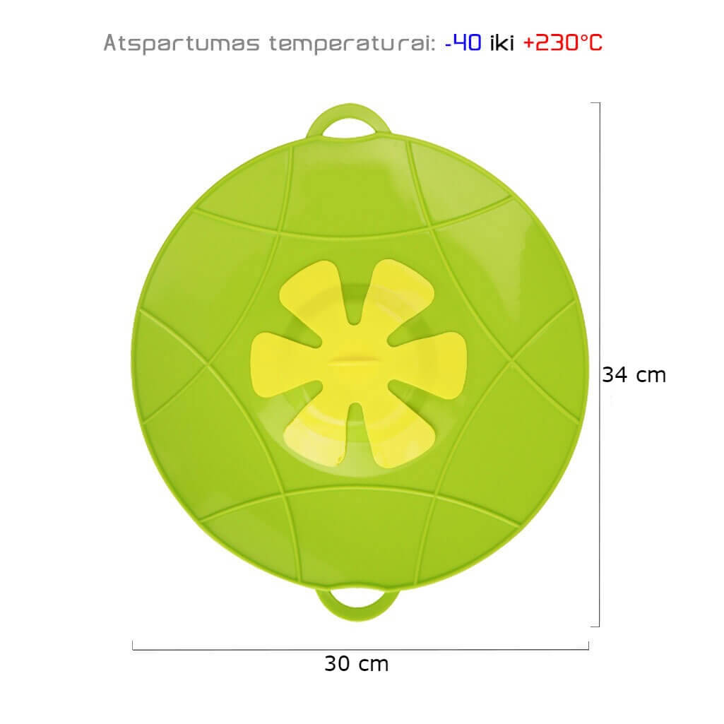 Naujoviškas silikoninis dangtis neleidžia išbėgti skysčiams pro kraštus, nes sandariai priglunda prie indo, o kylantys garai pakelia „gėlytės“ žiedlapius ir skystis susikaupia išgaubto dangčio paviršiuje bei nuteka atgal į indą.